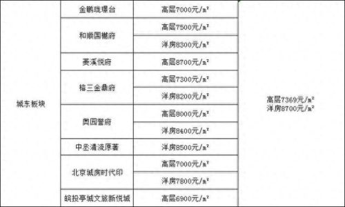 对比上月,城东板块高层由均价7486元/m²下降到7369元/m²、洋房均价均8240元/m²上涨到8700元/m²。