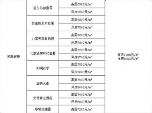 本月对比上月的数据,苏滁板块高层均价由7170元/m²下降为7158元/m²、洋房均价由7997元/m²上涨到8883元/m²。