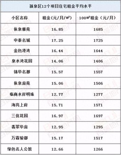 颍州租金15.02元/月/㎡领先各区县!环比上月3涨5跌!