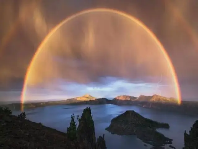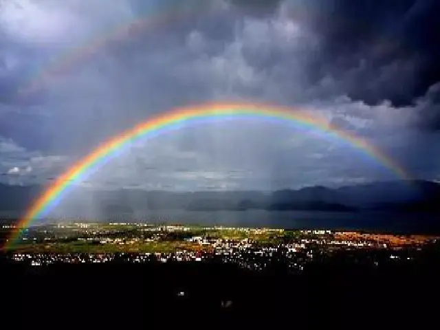①彩虹:日光与水气相映,呈现在天空中的弧形彩色光带。