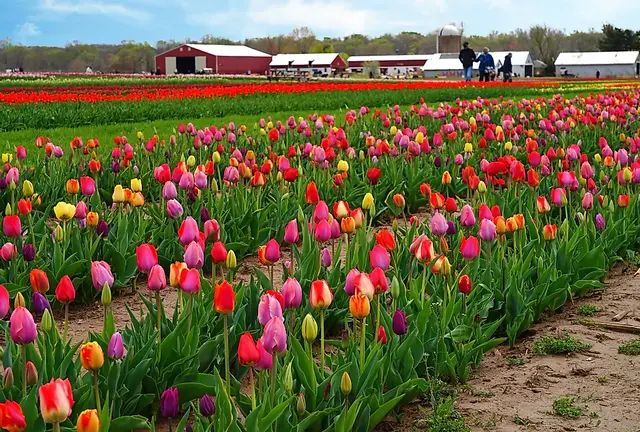 新泽西UpperFreehold五彩缤纷的郁金香田,盛开的鲜花在奶油岭。