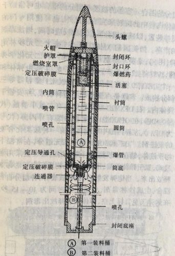 后来的的二元化学武器的基本构造,也是将两种或两种以上能产生毒剂的无毒或低毒化学物质(也叫毒剂中间体或组分),可以是液体,也可以是固体,分别装填在隔开的容器内。弹药发射(投掷)后,隔膜破裂使中间体在弹体飞行的短暂时间内进行混合而起化学反应,在到达目标的瞬间生成毒剂杀伤人员。