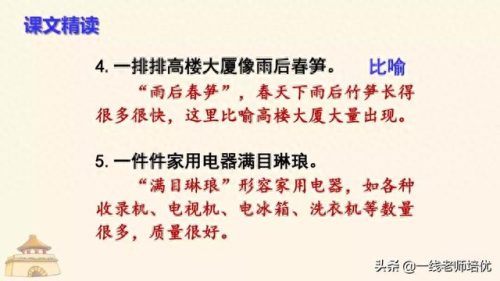 3.一排排高楼大厦像雨后春笋,一件件家用电器满目琳琅;我们永远告别了破旧的茅屋,却忘不了延安窑洞温热的土炕。航天飞机探索宇宙的奥妙,电子计算机奏出美妙的交响;我们毫不犹豫丢掉了老牛破车,但不能丢宝塔山顶天立地的脊梁。