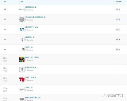 农业与林业学科,排名世界前100的德国大学依次是霍恩海姆大学、哥廷根大学、慕尼黑工业大学、弗莱堡大学、波恩大学,具体排名如下: