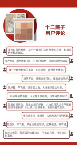 十二院子始于2016年,是一款主打国风新锐彩妆品牌。该产品设计理念也颇有深意,在中国“十二”是个美好的数字,十二时辰、十二生肖、十二金钗......“十二”包涵了圆满、轮回的含义。其中十二院子九色眼影盘,就是他们家人气最火的产品之一。