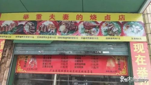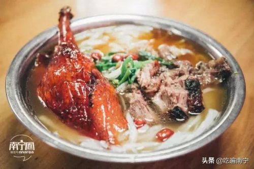 这家上过纪录片《宵夜江湖》南宁篇的烧鸭店,也被很多人推荐。是很简单的快餐店的形式,也有粉,饭点有不少人来吃。烤鸭都是当天新鲜出炉的烧鸭,油脂被烤得滋滋作响,外皮油滋滋的金黄色,让人看着就已经垂涎三尺。