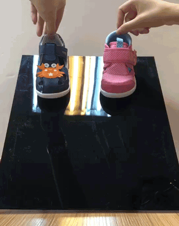2. 从动图中可以看出,大热宝宝凉鞋Mikihouse的防滑性非常差,而重量与它差不多的江博士则防滑性很好,放上斜面之后不会滑落。