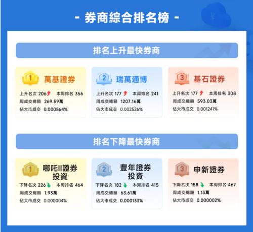 而在成交異動明顯的券商中:萬基證券、瑞萬通博、基石證券上升名次最快,其中萬基證券上周成交269.59萬排名356,相較前一周上升了206名。