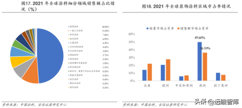 在全球装饰涂料领域,2021年亚太地区装饰涂料销售量和销售额分别为128.39亿L和297.46亿美元,市占率分别为49.6%和36.1%,位居全球第一,其次为欧洲和北美地区。