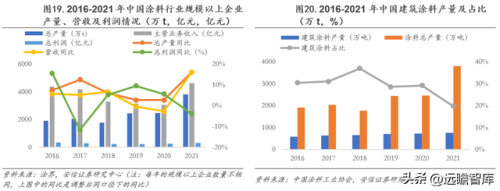 据中国涂料工业协会统计,2021年中国全年涂料行业产量约3800万t,预计同比增长16%;主营涂料业务收入预计超过4600亿元,较去年同期增长16%;利润总额预计可达303亿元,或由于下游地产行业调控叠加上游原材料涨价,利润端同比降低近4%。