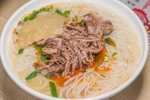 肥厚软糯的猪皮和粉色的肉,性感地躺在雪白的米线上,一瓢浓醇的汤汁浇在上面,肉和皮子,再度获得重生。