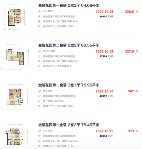 2、地理条件相对优越,比如棠德花苑、金碧花园等中心区的二手房;