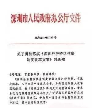 1988年6月,《深圳经济特区住房制度改革方案》出台,推出“以租促售,以卖为主,鼓励职工买房”的房改方案,这是我国第一个地方性的房改文件。