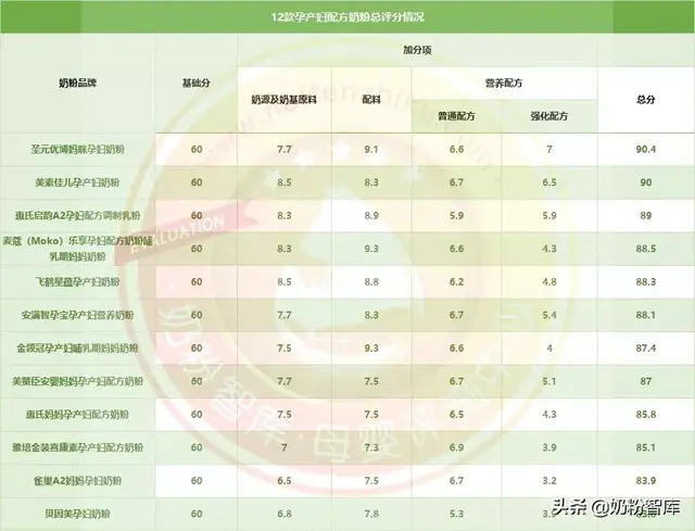 小结:从基础分、奶源与原料、配料、营养配方等几个方面综合来看,圣元优博妈咪孕妇奶粉最高,达到90.4分,其次是美素佳儿孕产妇奶粉、惠氏启韵A2孕妇配方调制乳粉、麦蔻(Moko)乐享孕妇配方奶粉哺乳期妈妈奶粉、飞鹤星蕴孕产妇奶粉、安满智孕宝孕产妇奶粉、金领冠孕产妇配方奶粉。