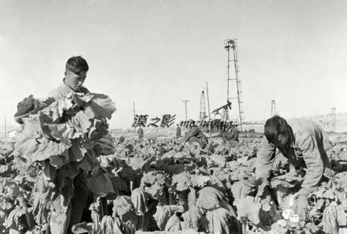 16、1960年10月玉门局2600余名职工和家属到市政各地兴办农场。图为1961年9月一油矿职工在井场边收获大白菜。
