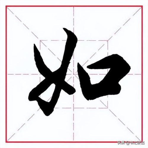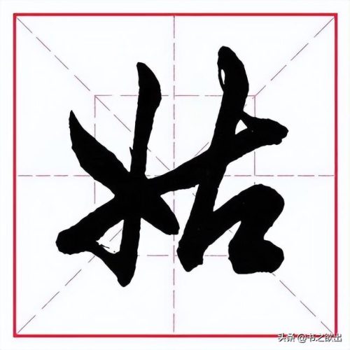首笔撇折以露锋斜切入笔,然后转锋向左下行,行笔略轻,至转折处再折笔向右,注意角度,行笔勿长,稍带弯度;撇画起笔勿远,角度稍立,撇身短促有力,收笔力达撇尖,不可一笔甩出;提笔起笔靠左、靠下,落笔后即向右上方引毫抗肩上行,由重及轻,收笔藏于撇画内。整体形窄,不宜宽放,以让右部。