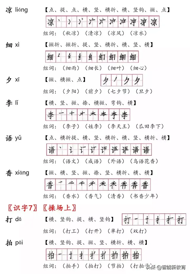 7 操 cāo 场 chǎnɡ 拔 bá 拍 pāi 跑 pǎo 踢 tī 铃 línɡ 热 rè