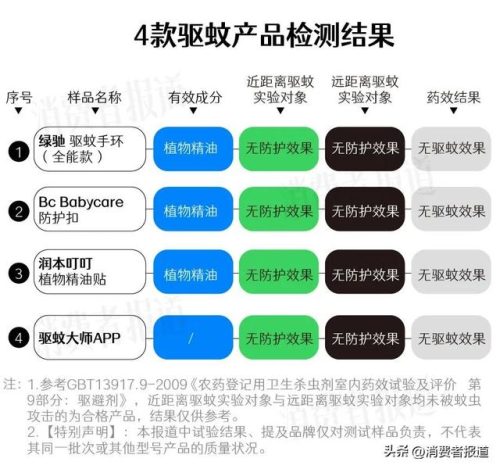 结果显示,驱蚊手环、防蚊扣、驱蚊贴、驱蚊APP这4款驱蚊产品堪称智商税,实验室检测验证无防护效果,2款灭蚊灯杀蚊效果也不显著。