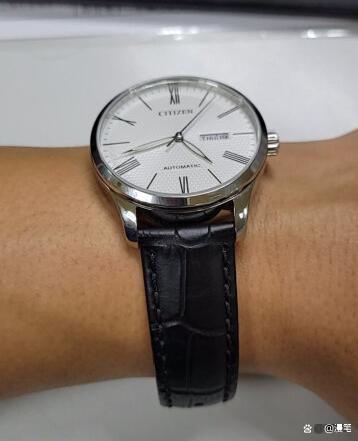 这是西铁城经典机械腕表,商务休闲风格,非常大气, 深海蓝表面,银色表带,搭配很好。