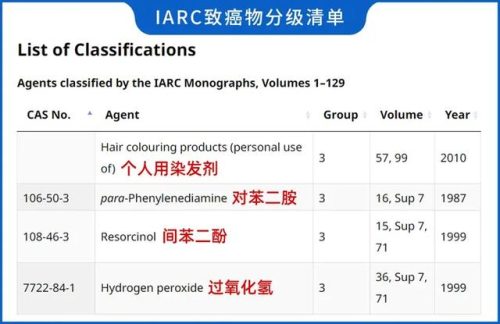 除此之外,我们还发现国际癌症研究机构也将染发剂常见成分(如对苯二胺、间苯二酚、过氧化氢等)列为三类致癌物。所谓的三类致癌物,指的是对人体致癌性尚未归类的物质或混合物。