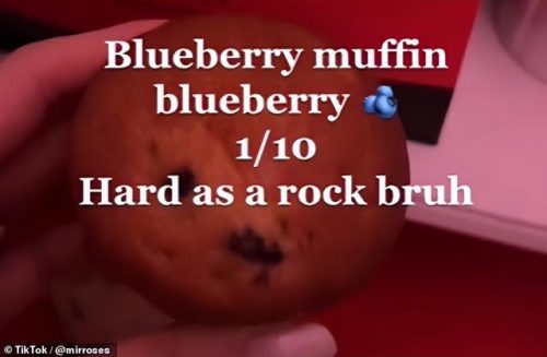 早餐包括“烧焦”和“小”羊角面包 (2/10)、“硬如岩石”蓝莓松饼 (1/10) 和“干冷”面包卷 (2/10),只有橙汁获得了 10/10。