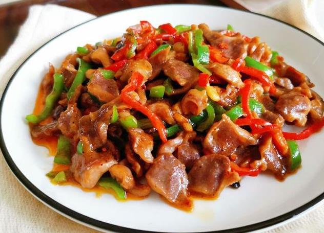 7. 加入红柿子椒、杭椒、泡椒,充分翻炒,使鸡胗和辣椒的味道相互融合。