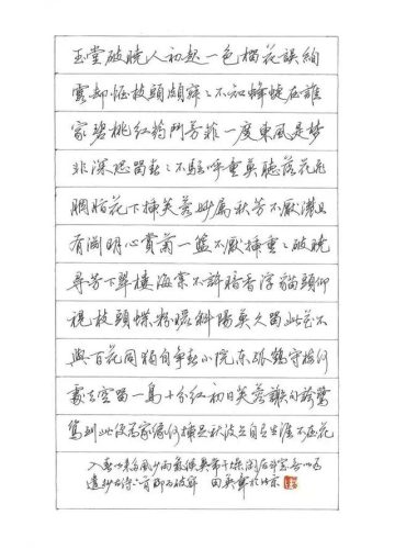 钱老师的行书具有“秀、劲、畅”三位一体的风格,流畅,痛快;很多人从临摹钱老师的字体入手开始学习硬笔书法。他的字瘦长,适合写细瘦字形的朋友。