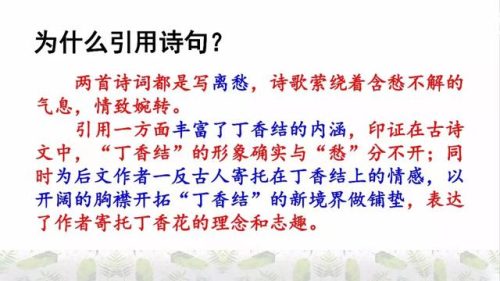 “芭蕉不展丁香结”、“丁香空结雨中愁”,这两句诗中把花蕾丛生的丁香,喻人愁心不解,丁香在古人的眼中就是惆怅的代表,愁思的象征。作者引用古诗句有利于表达自己的感情,使意境更加优美。