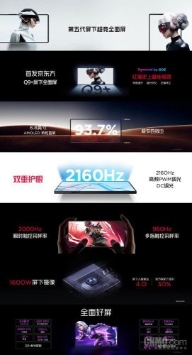 而在正面,红魔9 Pro系列配备第五代屏下超竞全面屏,拥有93.7%屏占比,视效为红魔史上最佳。具体来看,该机首发京东方屏下Q9+发光材料,支持2160Hz超高频PWM调光+DC调光以及960Hz多指触控采样率+2000Hz屏幕瞬时触控采样率,游戏触控极致灵敏。