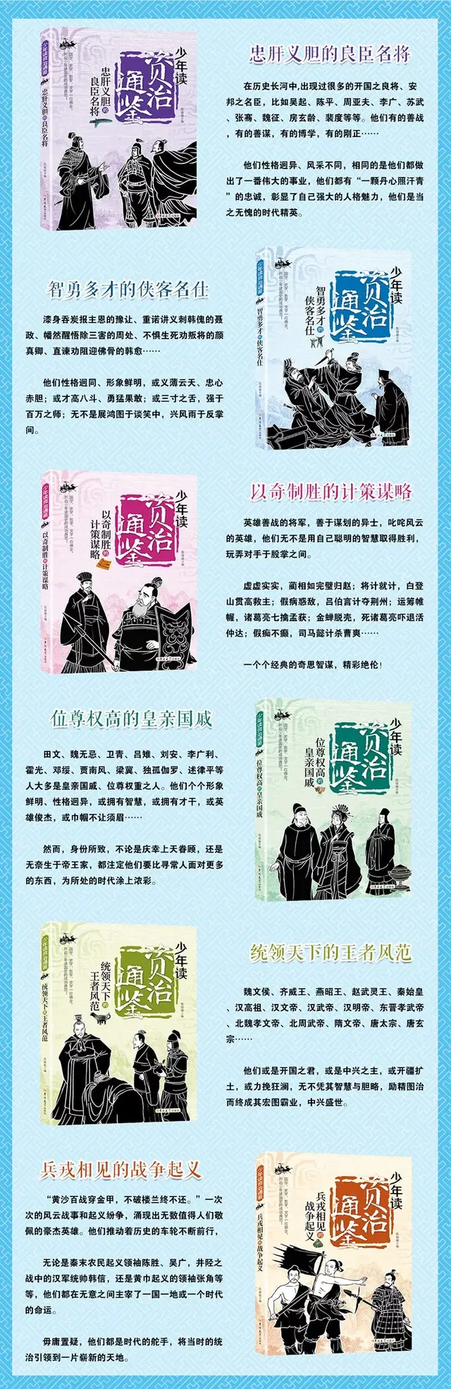 内容上更加简洁易懂,编排上更加方便,分别从侠客名仕,王者风范,良臣名将,战争起义,计策谋略,皇亲国戚六个方面整合,分为六册。