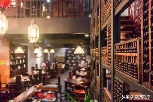 最吸睛的是:一面全是由大小不一、年份不同的算盘组合而成的墙壁,那是真正的收藏品,彰显着店家的好品味!