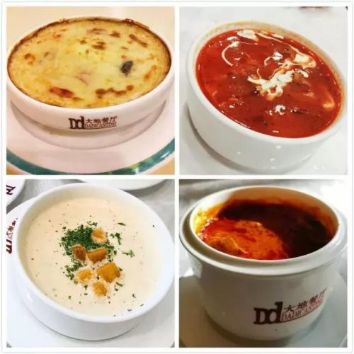 俄式的代表菜罐焖牛肉料足、软烂,在味道上有些偏甜。奶油烤杂拌、红菜汤、奶油蘑菇汤,也是桌桌必点。来大地这用餐的基本上都是有些岁数的长辈,和来回味童年的瓷器。