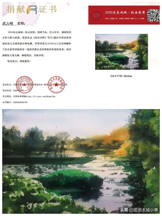 疫情期间,武占刚想为国家出一点力,但作为一名人民教师,他不能和医护人员一样冲往前线,于是他将自己的作品《清水河畔》放在中国水彩商场义卖,并将义卖所得的500元全部捐给了抗疫一线。