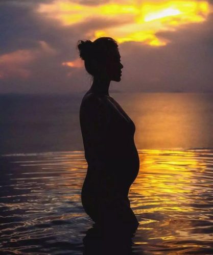 夕阳西下,她挺着孕肚,站在大海边,时而闭眼冥想,时而开怀大笑,模样恬静而温柔,与远处渐渐暗淡的天空交相辉映。