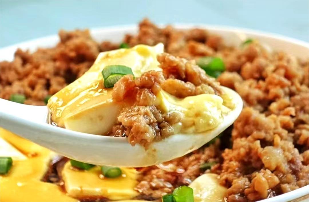 步骤四:把肉末炒熟,鸡蛋羹凝固后,将肉末铺在鸡蛋羹上,继续蒸2分钟。出锅淋上一点生抽、香油、撒一点葱花即可。嫩滑可口,低脂低热量,快来试试。