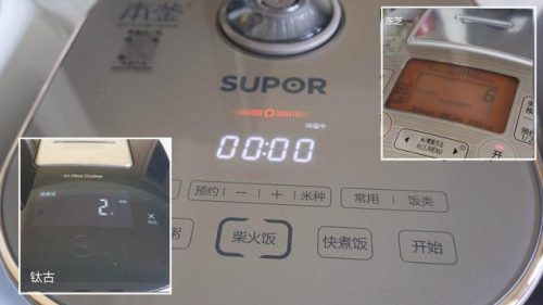 开启煮饭功能,发现东芝的电饭煲显示煮饭时间55分钟,钛古的是50分钟,不过苏泊尔的没有时间显示,可以看到工作状态。