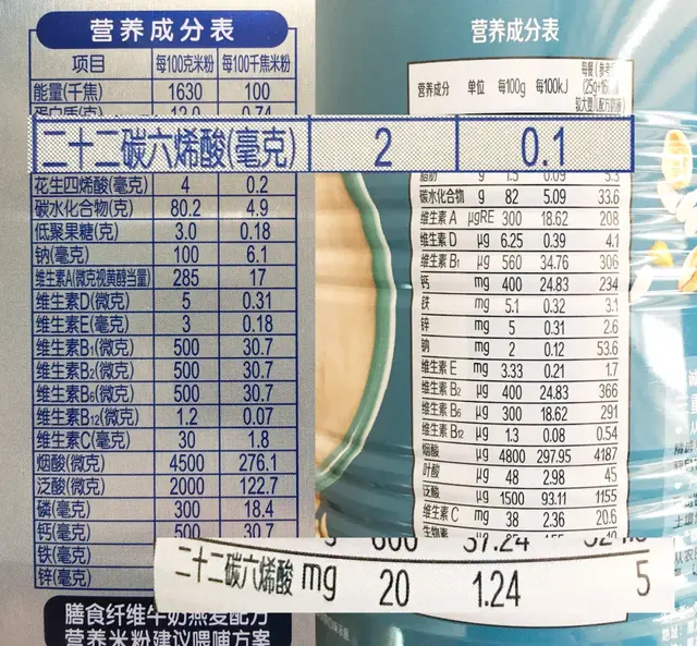 本次测评的7款谷物米粉中,亨S、嘉B强化了DHA,添加量分别为2mg/100g、20mg/100g。