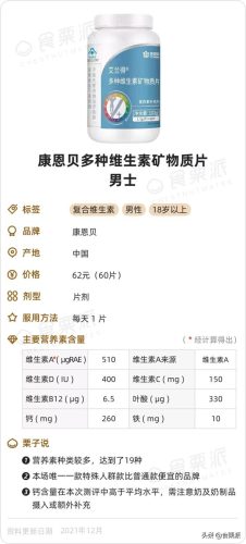 看了一圈下来,觉得这款对素食者、不爱吃肉的人来说,是性价比最高的,比较容易缺的叶酸、维生素B12、铁、锌等营养素都兼顾到了,添加量还不算低,价格也是很美腻的。