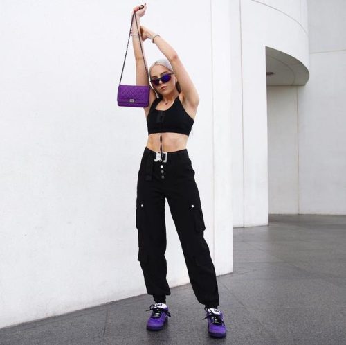 紫龙虾 Concepts x Nike Dunk SB Low 和紫色的香奈儿包包,再加上紫色的太阳镜,这身搭配可以说是街头又奢华。