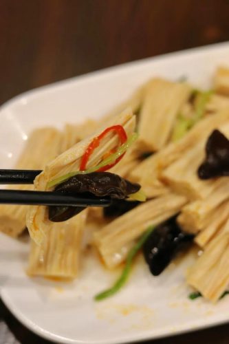 素烧鹅大约可以算素斋里的人气明星,陈师傅说以前他在灵隐寺斋堂里(十方苑)做时,“豆腐皮每天都是几麻袋几麻袋运进来,香客们喜欢烧好香,买一条当零食一样边走边吃,我一天要做好几百条。”