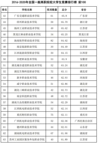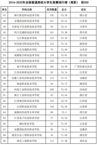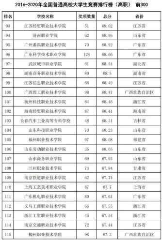 据统计,五轮总榜单(高职)中,金华职业技术学院位列榜首、北京工业职业技术学院和北京电子科技职业学院分列第二名和第三名。2016-2020年榜单(高职)共列入全国1071所高职院校,金华职业技术学院位列榜首,重庆电子工程职业学院和深圳职业技术学院分别位居第二名和第三名,第四到第十名分别是芜湖职业技术学院、山东商业职业技术学院、福建信息职业技术学院、长沙民政职业技术学院、江西环境工程职业学院、江西应用技术职业学院、陕西工业职业技术学院。