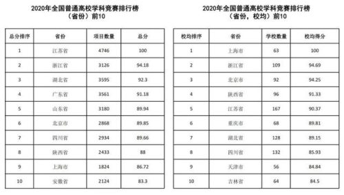 2021年3月22日,中国高等教育学会高校竞赛评估与管理体系研究工作组发布2020全国普通高校大学生竞赛排行榜,其中包含本科院校榜单13个、高职院校榜单10个、省份榜单3个(详见表1)。