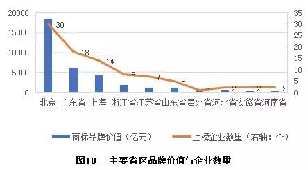 在地域分布方面,“百强”企业来自全国20个省、自治区和直辖市,其中北京、广东和上海的上榜企业数量、商标品牌价值总额皆位居前三。