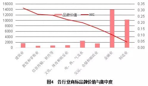 在品牌价值行业集中度方面,各行业价值集中度差异较大。入选总榜超过4个企业的行业共8个,以HHI 比较品牌价值的行业集中度,可以发现金融、制造业上榜企业数量虽多,但品牌价值集中度相对较低,而建筑、批发和零售以及信息传输、软件和信息技术服务业相反,其品牌价值集中度较高,更少的企业拥有更多的品牌价值。