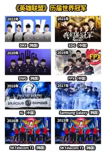 2、S8的世界冠军IG,由The Shy、Ning、Rookie、Jackeylove和Baolan组成。S9的FPX夺冠,GimGoon、Tian、Doinb、Lwx和Crisp是他们的关键队员。最后,S10冠军DWG的阵容强大,Nuguri、Canyon、showMaker、Ghost和BeryL并肩作战。