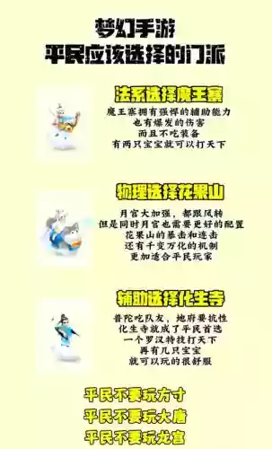 3、选择梦幻西游端游中的哪个职业,取决于你的游戏目的。如果你主要追求做任务,天宫是一个不错的选择,它的技能可以有效消耗对手的蓝量,但需要注意的是,天宫消耗蓝量较多。而大唐虽然抗性不高,但其技能的点选伤害非常高,适合喜欢PK的玩家。