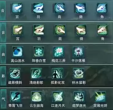 是长歌门派的系列技能,包括回梦逐光、笑傲光阴、云生结海、江逐月天。回梦逐光:在自身位置创建一个10尺的音域圈,最多复制5名敌对玩家的影子表现,持续8秒,音域期间再次施展技能则将其传送回影子所在位置。