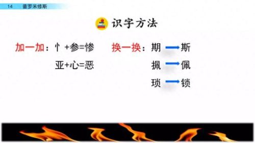 (1)普罗米修斯看到太阳神阿波罗驾着太阳车从天空中驶过,就跑到太阳车那里,从喷射着火焰的车轮上,拿取了一颗火星,带到人间。