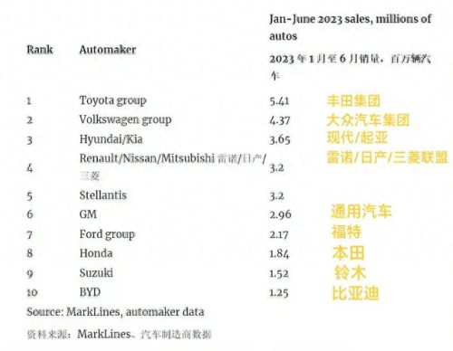近日,MarkLines汽车制造商发布了一组今年全球上半年汽车品牌销量数据:公布了全球十大销量最高的车企,从整个榜单来看,日系占据了四个名额,分别是排名第一的丰田,第四的雷诺/日产/三菱联盟,排名第八的本田和第九的铃木。德系只有大众上了榜单,排名第二位,美系则是福特和通用上榜,法系排在了第五位,华系的品牌只有比亚迪进了前十名,上半年卖了125万辆。