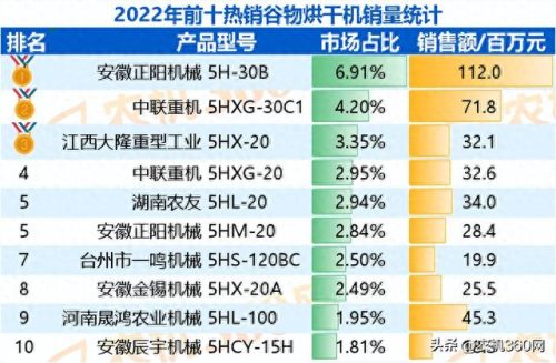 2022年谷物烘干机补贴销售9700多台,实现销售额14.27亿元。前十大热销谷物烘干机共销售3117台,占总销量的32%。